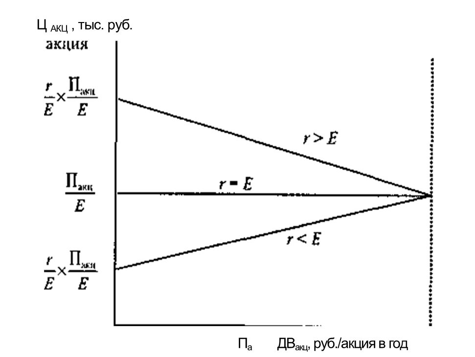 В нормальной для предприятия ситуации, когда рентабельность инвестиций превышает коэффициент дисконтирования (r > Е), большинство инвесторов готовы заплатить высокую цену за акцию, предпочитая большие будущие доходы меньшим текущим.