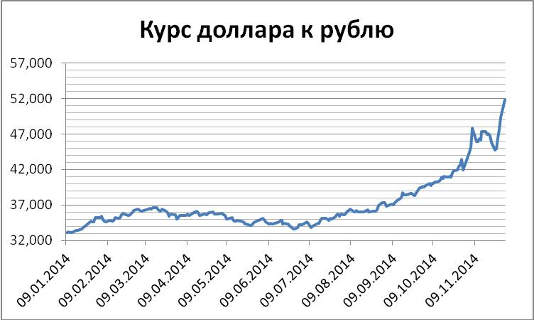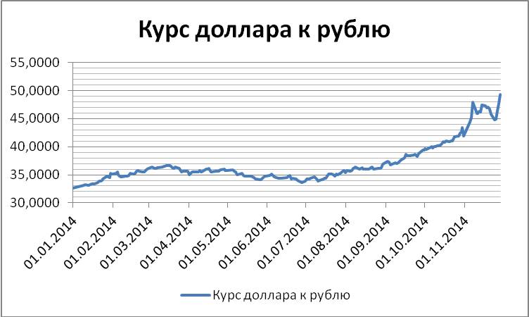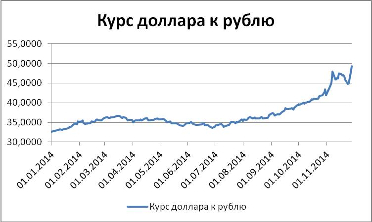 Шаг 5. В результате этих действий у нас изменился масштаб графика колебаний курса доллара к рублю. В связи с тем, что эти изменения приблизили масштаб к значениям курса доллара к рублю за 2014 год, по этому графику стало удобнее найти начало текущего тренда. См. график в новом масштабе на рис. 1.7.
