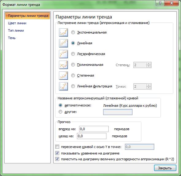 Шаг 5. В появившемся после этого диалоговом окне ФОРМАТ ЛИНИИ ТРЕНДА нужно ниже названия ПАРАМЕТРЫ ЛИНИИ ТРЕНДА выбрать опцию ЛИНЕЙНАЯ. Кроме того, в самом низу диалогового окна надо выбрать дополнительные опции ПОКАЗЫВАТЬ УРАВНЕНИЕ НА ДИАГРАММЕ и ПОМЕСТИТЬ НА ДИАГРАММУ ВЕЛИЧИНУ ДОСТОВЕРНОСТИ АППРОКСИМАЦИИ (R^2). (Для тех, кто не знает, знак ^ означает возведение в степень). Образец заполнения окна ФОРМАТ ЛИНИИ ТРЕНДА ? см. рис. 1.11.