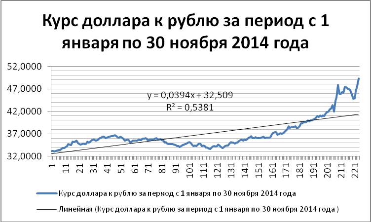 Формула этого тренда Y = 0,1231X + 32,101 означает, что при увеличении номера торгового дня X на одну единицу (то есть с каждым последующим торговым днем) величина курса доллара Y в период с 27.06.2014 г. по 28.11. 2014 г. в среднем вырастала на 12,31 копейки при исходном уровне (то есть перед началом торгов 27.06.2014 г.), равном 32,101 рублей.