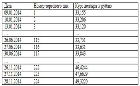 Таблица 1.2. Курс доллара к рублю с 1 января по 30 ноября 2014 года с параллельными датами и порядковыми номерами торговых дней.