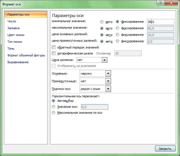 Шаг 2. После этого в появившемся окне нужно ? ниже названия ПАРАМЕТРЫ ОСИ и левее варианта МИНИМАЛЬНОЕ ЗНАЧЕНИЕ ? выбрать опцию ФИКСИРОВАННОЕ, в которой установить число 30. См. заполнение диалогового окна ФОРМАТ ОСИ на рис. 1.5.