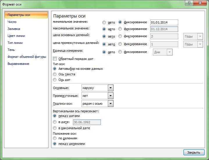 Шаг 4. После того как в Excel появится диалоговое окно ФОРМАТ ОСИ, нужно в этом окне ? ниже названия ПАРАМЕТРЫ ОСИ и левее варианта МИНИМАЛЬНОЕ ЗНАЧЕНИЕ ? выбрать опцию ФИКСИРОВАННОЕ, в которой установить новую начальную дату – 01.01.2014. См. заполнение диалогового окна ФОРМАТ ОСИ на рис. 1.6.