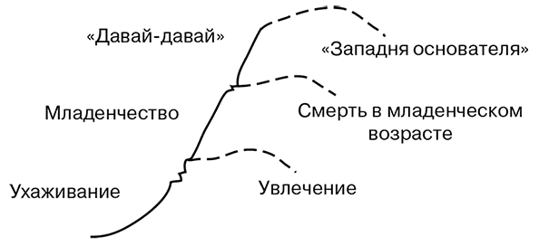На ранних этапах – от ухаживания и до «давай-давай» – основатели отождествляются со своими компаниями, а компании – со своими основателями. Компании и их основатели неотделимы друг от друга. Когда молодым компаниям требуются банковские кредиты, то в качестве обеспечения этих кредитов основатели компаний часто используют личное имущество. Банки полагаются на энергию основателей как на гарантию возврата взятых кредитов.
