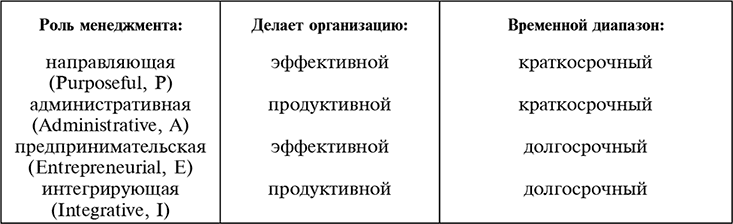 И. Адизес определил четыре управленческие роли и зависимость этих ролей от этапа жизненного цикла, на котором находится организация [4]. Это своего рода методология диагностики и организационной терапии. Так как связь между каждой ролью и конкретным типом организационного поведения очевидна (табл. 2), существует возможность определять, отсутствие каких ролей вызывает те или иные управленческие «болезни».