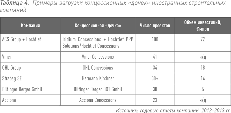 Анализ годовых отчетов крупнейших строительных компаний западных рынков подтверждает мнение об их лидерстве в подобного рода проектах. Дочерние ГЧП-компании выступают лидерами проектов, управляют консорциумами и передают значительные объемы физического исполнения проектов своим материнским компаниям.