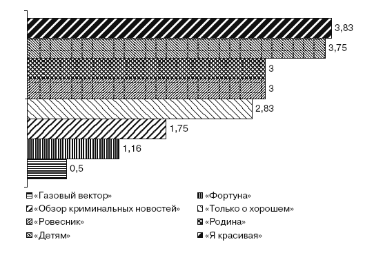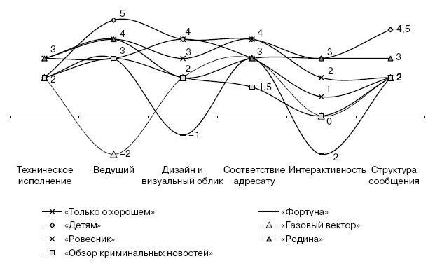 Интересной в плане педагогики, но немного недотянутой по качеству оказалась программа «Детям». Ниже всего эксперты оценили телепередачи «Фортуна» и «Газовый вектор»: первую из-за недостаточно развернутого портрета учителя города, вторую – из-за непонимания целей отдельной газовой телепрограммы при наличии уже упоминавшейся газовой передачи «От Малиновки до Зюзино» и за низкое качество. Общие оценки этих программ приведены на рис. 1.5.