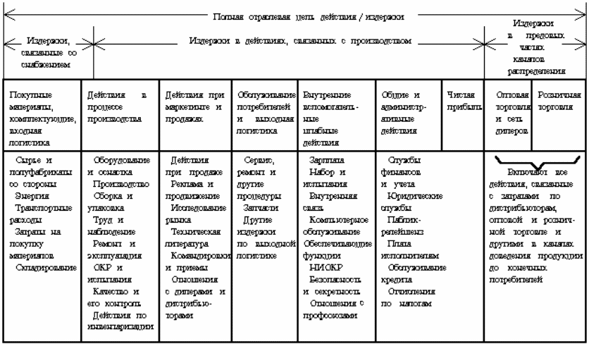 Стратегический стоимостный анализ фокусируется на относительной стоимостной позиции фирмы по отношению к ее соперникам. Первичным аналитическим подходом такого анализа является построение стоимостной цепи по отдельным действиям, показывающей картину стоимости от сырья до цены конечных потребителей (табл.6.2). Эта таблица показывает, что имеется три главных области в цепи действия/издержки, где возможны наибольшие различия для конкурирующих фирм: область снабжения, передовые части каналов распределения, собственно внутренняя деятельность компании. Если фирма теряет конкурентоспособность в задней или передней частях цепи, она может изменять свои внутренние действия с целью восстановления конкурентоспособности.