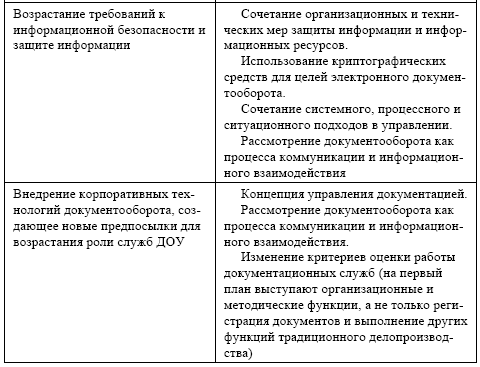 В табл. 5 представлены некоторые особенности современного этапа организации работы с управленческими документами (по сути, представляющие конкретные направления работы) в сопоставлении с основными концептуальными подходами, призванными обеспечить их развитие.
