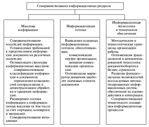Значимые для управленческого документооборота основные направления совершенствования информационных ресурсов представлены на рис. 9. К ним относятся совершенствование массивов информации и информационных потоков, развитие информационных технологий и технического обеспечения информационных процессов.