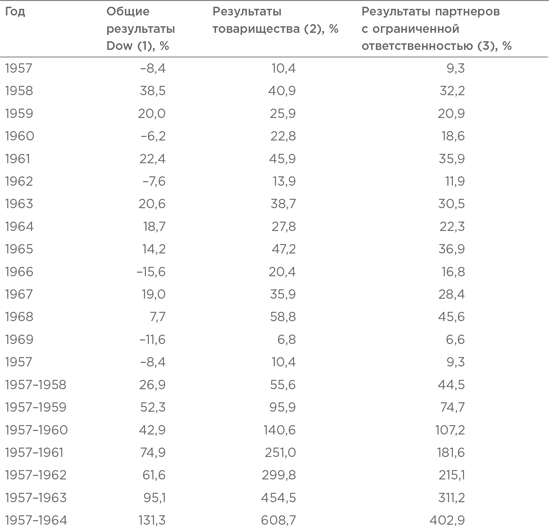 (2) Период 1957–1961 гг. включает в себя объединенные результаты всех предшествующих товариществ с ограниченной ответственностью, функционировавших в течение полного года, после всех затрат, но до выплат партнерам с ограниченной ответственностью и полному партнеру.