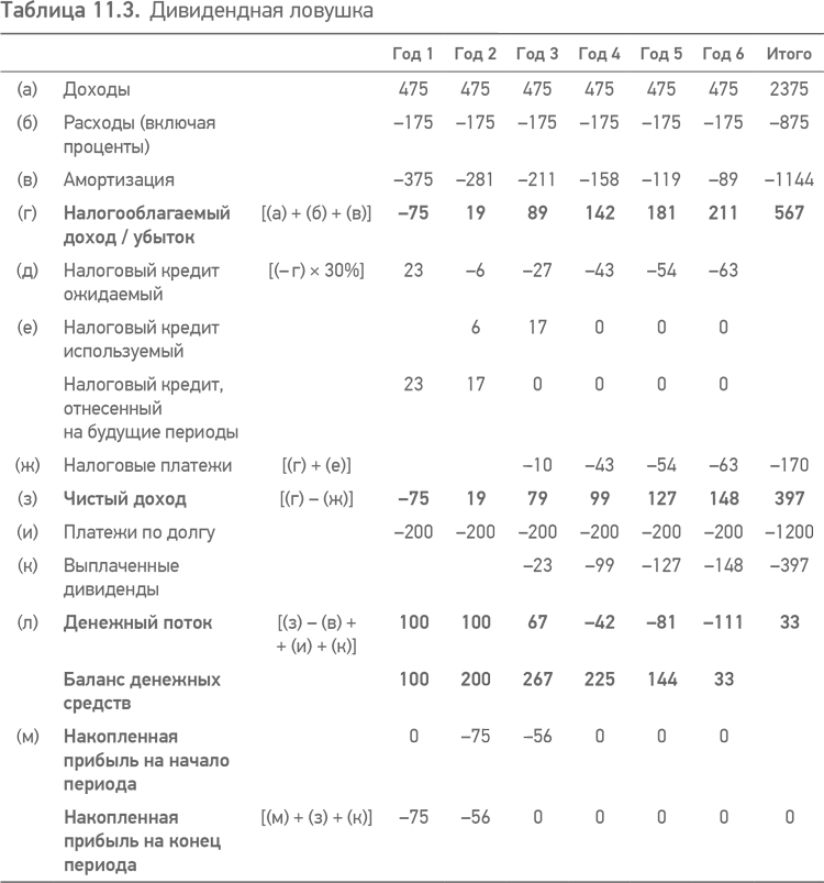 Другая причина, почему собственный капитал акционеров часто представляется в виде комбинации акционерного капитала и субординированного займа акционеров (которая ставит заимодавцев в точно такое же рискованное положение, предполагая, что права инвесторов полностью зависимы в платежах и способны возрастать, так же как права заимодавцев, – см. § 11.13.5), – это возможность попасть в ситуацию, которая известна как «дивидендная ловушка» (dividend trap), при которой проектная компания имеет денежный поток, но не может платить дивидендов своим инвесторам из-за отрицательного баланса по отчету о прибылях и убытках, как это представлено в табл. 11.3.