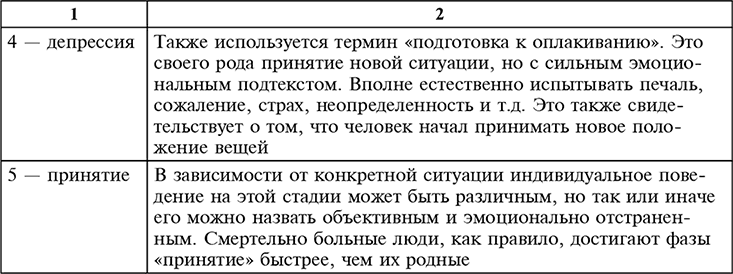 Доктор Элизабет Кюблер-Росс, американский психолог, создательница концепции психологической помощи умирающим, установила, что реакция человеческого сознания на негативную информацию проходит пять фаз: отрицание, гнев, «сделка с судьбой», депрессия и, наконец, принятие (табл. 4).