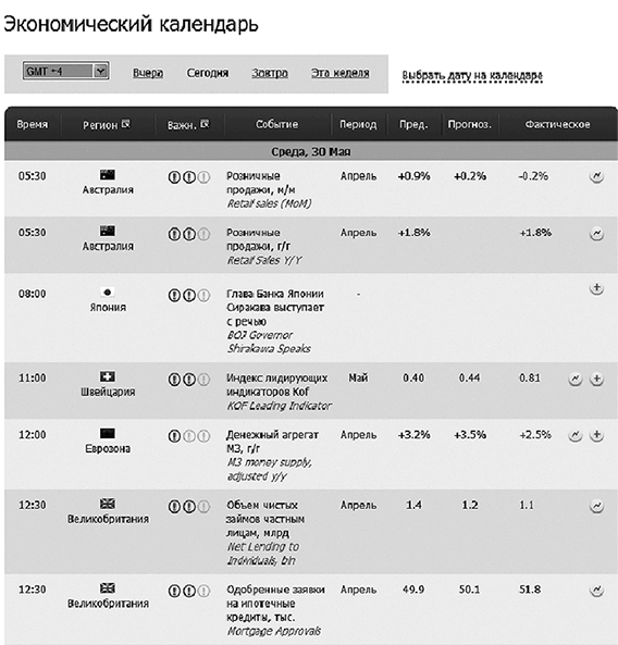 Календари есть во всех приличных информационных системах и на сайтах всех серьезных организаций, занимающихся предоставлением услуг, необходимых для работы на финансовых рынках. В зависимости от компании информация может быть как на английском, так и на русском языке. Далее приведен пример странички из календаря, который можно видеть на сайте компании TeleTRADE.