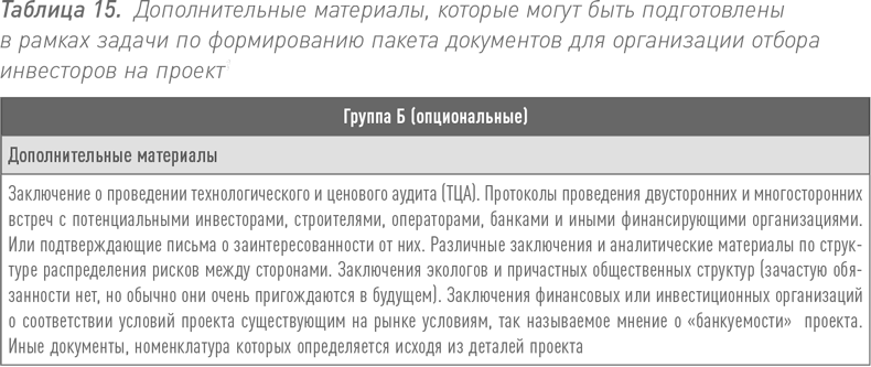 Если стоит такая задача, то мы рекомендуем ограничиваться не только стандартным пакетом документов, но и потратить специальные усилия на оснащение проекта рядом дополнительных материалов (см. таблицу 15)[22].