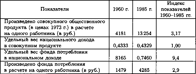 Так, по данным авторов, в стране за 25 лет (с 1960 по 1985 г.) годовое производство фонда потребления увеличилось в расчете на одного работника материального производства в 2,9 раза {323} (см. табл. 1).
