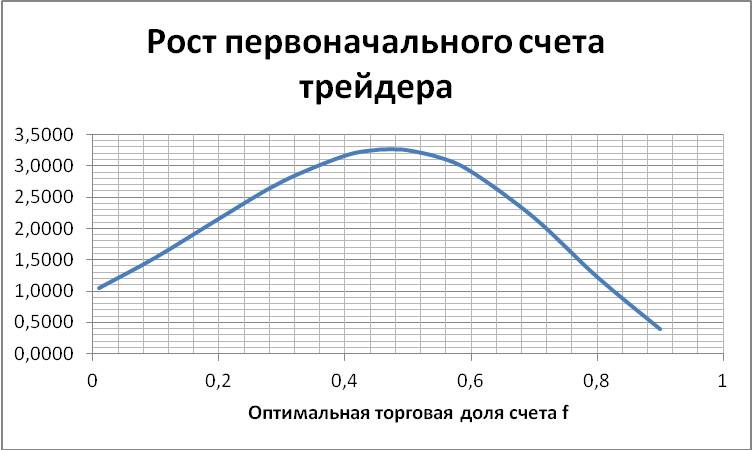 При этом оптимальная торговая доля счета f ищется путем подстановки в эту формулу ее значений в диапазоне от 0,01 до 1. Поиск прекращается, когда при данном значении доли счета f рост первоначального счета трейдера достигает максимального значения. Используя Excel, эту задачу можно довольно быстро решить.