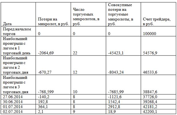 Поскольку мы решили торговать микролотом в размере 1000 долларов, то, следовательно, суммы доходов и потерь в разделе «Доходы (потери) на микролот, в руб.» получены путем умножения соответствующих цифр из раздела «Изменение, в руб.» на 1000 и вычитания стоимости спреда в размере 200 пунктов за стандартный лот =100000 долларов.