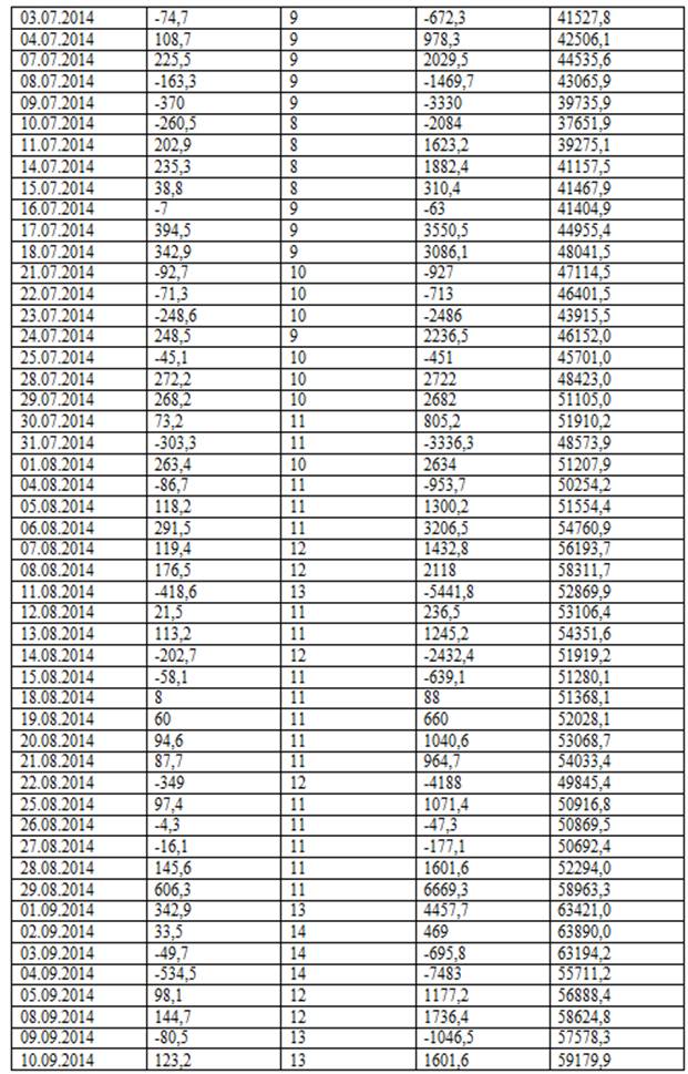 Теперь протестируем, каких результатов нам удалось бы достичь, если бы мы заняли длинную позицию на рынке с 27 июня по 30 ноября 2014 года, согласно только что сделанным нашим расчетам, исходя из которых оптимальная доля нашего счета f = 0,47. То есть, если бы мы в начале этого периода купили бы 22 микролота долларов США, имея на каждый микролот по 4392,95 руб. на своем счету.