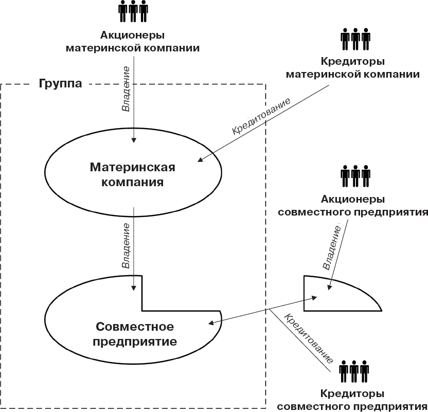 В случае совместного предприятия (joint entity) стороны образуют новую компанию, в которой каждый участник имеет свою долю (рис. 1.3). Предприятие ведет самостоятельный учет и формирует собственную финансовую отчетность, а каждый учредитель отражает свое участие в этом предприятии в своей отчетности как финансовый актив.