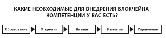 Существует пять категорий компетенций, необходимых для полного развертывания решений на блокчейне внутри компании: образование, открытие, проектирование, разработка и управление.