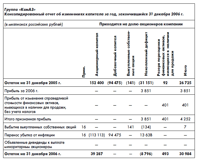 Дело в том, что финансовые активы для продажи обычно есть у компаний, которые главным образом занимаются каким-то другим бизнесом, а не игрой на фондовом рынке. Если бы прибыли и убытки от изменений курсов ценных бумаг отражались сразу в отчете о прибылях и убытках, это ввело бы дополнительный фактор, затрудняющий анализ финансовых результатов таких компаний и сравнение компаний между собой. Аналитикам пришлось вычленять доход или убытки от ценных бумаг от финансовых результатов основного бизнеса компании, что может быть и не просто. Вместе с тем скрывать от пользователей финансовой отчетности потенциальные убытки по ценным бумагам было бы неправильно. Компромиссный вариант был найден: отчет об изменениях в собственном капитале. Фактически этот отчет был придуман для того, чтобы в нем отражать операции, которые отклоняются от обычного бизнеса компании и при их отражении в отчете о прибылях и убытках могли бы исказить реальную работу компании. Вот пример отчета об изменениях в собственном капитале Группы «КамАЗ» за 2006 г.: