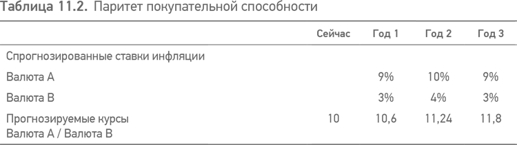 Точно так же как и при прогнозировании процентных ставок, существует два подхода в процессе прогнозирования курсов валют: или а) возможно сделать специальное предположение относительно будущих курсов, или б) могут быть использованы ставки паритета покупательной способности. В последнем случае при вычислении учитывается разница в прогнозируемом коэффициенте инфляции для двух валют и соответствующим образом корректируется курс, основываясь на допущении, что будущий курс двух валют будет изменяться в соответствии с их инфляционной разностью (табл. 11.2). На первом году, с разницей в коэффициентах инфляции в 6 % в пользу валюты В, валюта А обесценится по отношению к валюте В на 6 % и т. д.