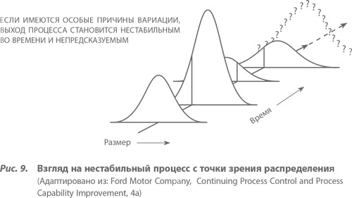 В книге «Выход из кризиса» Деминг негативно отзывается об этих работах, указывая, что на практике, в противоположность теории или гипотезам, идеально стабильных процессов вообще не существует. т. е. реальный процесс никогда полностью не свободен от особых причин, в том смысле, в котором он был определен при рассмотрении случая в Ford Motor Company. Иными словами, ситуация, представленная на рисунке 8, никогда не сможет реализоваться. Это означает, что между обычными математическими предположениями и реальным миром существует глубокая пропасть. Что это предполагает? Конечно же, не то, что мы должны проводить все наше время в поисках особых причин, не занимаясь улучшением процесса, т. е. работая с общими вариациями. Конечно, нет. То, что нам нужно, – это некий руководящий принцип, когда особые причины приносят нам достаточно проблем, чтобы оправдать особое к ним внимание. Этот образ мышления исключительно хорошо отражен в само?м определении управляемых и неуправляемых вариаций, которое Деминг использовал в Японии в 1950 г., хотя оно и не появляется в его современных работах.