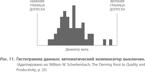 Итак, целью работы Шухарта было улучшение качества за счет уменьшения вариации (изменчивости) – точно в соответствии со словами Деминга в начале этой главы. Как мы видели в главе 2, Деминг вскоре осознал, что идеи Шухарта применимы к значительно более широкому кругу проблем, нежели только к технологическим операциям. В последующие десятилетия, развивая идеи Шухарта, Деминг заложил основу своей философии менеджмента. В частности, фундаментальные доводы, приведшие его к отрицанию таких широко распространенных в менеджменте подходов, как управление по целям, аттестация персонала и использование произвольных численных норм и критериев (пункты 11 и 12), вытекают из концепции недопустимости вмешательства в стабильную систему (это будет проиллюстрировано ниже на примере автоматического компенсатора погрешностей, см. также главу 5).