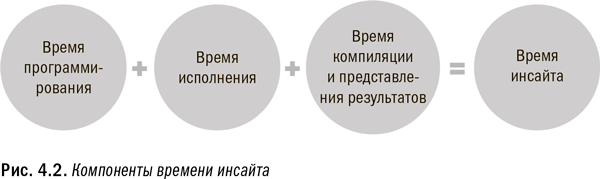 Время инсайта включает в себя все – от приобретения до подготовки данных, периода программирования, осуществления аналитического процесса, поиска инсайта в результатах (см. рис. 4.2). Другими словами, это время от старта до финиша. Например, если один вариант требует 60 минут на программирование, 30 минут на выполнение программы и 10 минут на исследование результатов, то время инсайта составит 100 минут. Если другой вариант требует всего 20 минут на программирование, но 60 минут на выполнение программы и еще 20 минут на исследование результатов, то время инсайта также составит 100 минут. Таким образом, у обоих вариантов одинаковое время инсайта, хотя и ведут к нему разные пути. Это значит, что в бизнес-кейсе необходимо учесть различия в стоимости отдельных компонентов двух вариантов. Например, дополнительные затраты труда (программирование) стоят намного дороже, чем дополнительная компьютерная обработка, и человеческий труд зачастую является самым большим компонентом времени инсайта.