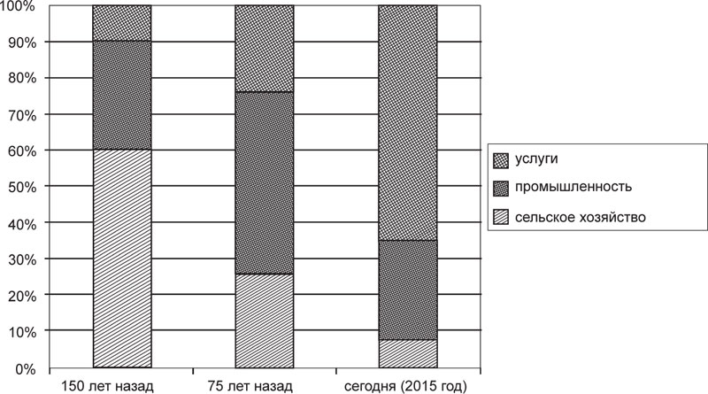 Отчётливо видим, что сто пятьдесят лет назад экономика всё ещё была аграрной, семьдесят пять лет назад – промышленной, а теперь в ней доминируют услуги.