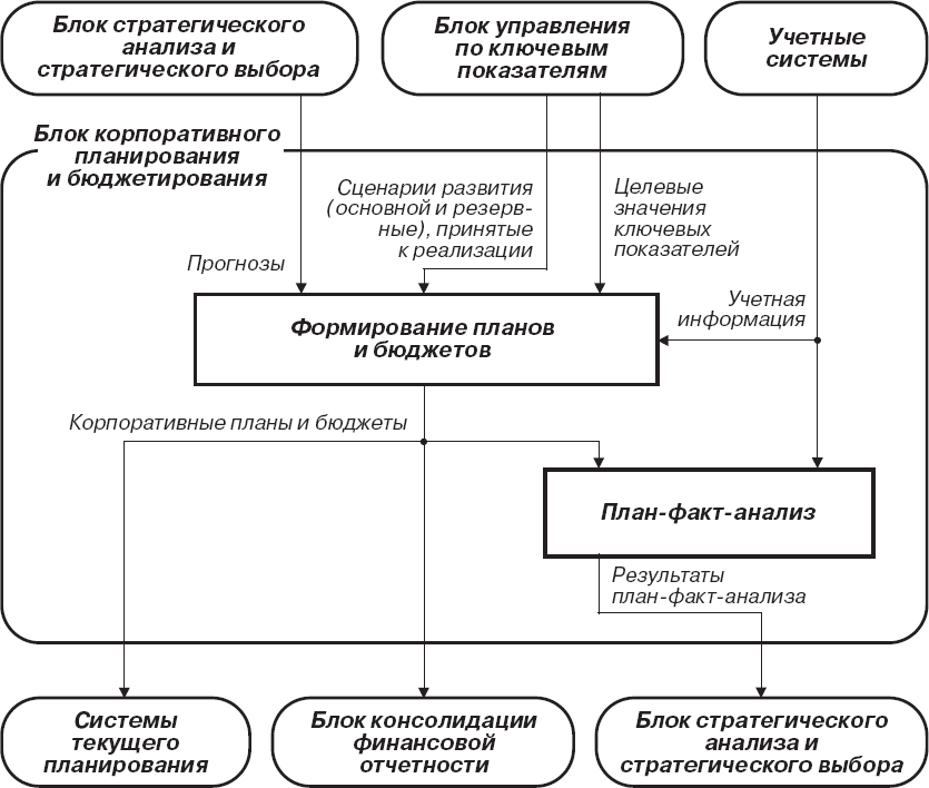 Целевые значения ключевых показателей и сценарии развития поступают на вход модуля формирования планов и бюджетов из блока управления по ключевым показателям, прогнозы – из блока стратегического анализа и стратегического выбора, учетная информация – из учетных систем.