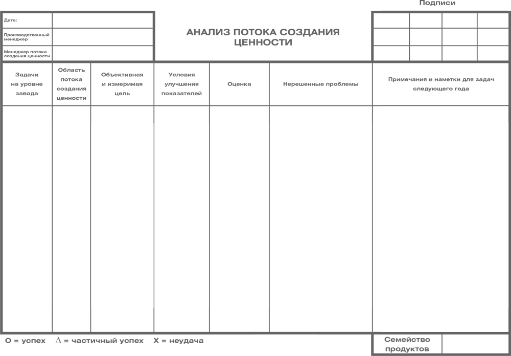 Вы можете также использовать ежегодный план потока создания ценности для квартальной или месячной оценки производственной деятельности как основной метод анализа работы: «Приносите мне вашу карту будущего состояния потока создания ценности вместе с честной оценкой ежемесячных улучшений». На следующей странице мы приводим пример формы анализа потока создания ценности. Перед проведением анализа менеджер потока создания ценности должен честно оценить степень достижения каждой цели будущего состояния: цель достигнута (O), цель почти достигнута (?), цель не достигнута (X).