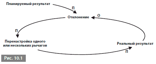 Последние несколько страниц были написаны в терминах системного мышления. Особенно последний абзац, где говорится о том, что сравнение планируемых результатов с реальными ведет к перенастройке одного или нескольких рычагов. Конечно, это уравновешивающая петля (рис. 10.1).