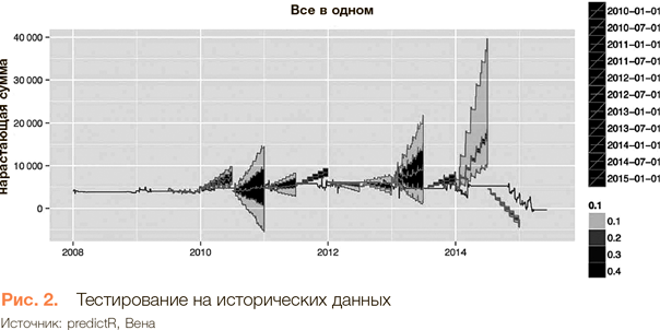 Алгоритмы прогнозирования тестировались на семилетних статистических данных. Было обработано пошаговое введение двухлетних данных, и финальные прогнозы сравнивались с реальными данными. Результат, показанный на рис. 2, получен из расчета стандартной модели (порядковая статистика). Видно, что прогнозы переоценивают негативные и позитивные тенденции, что может быть в дальнейшем скорректировано при помощи взвешенных оценок. Когда используются взвешенные оценки, разница между результатами тестирования на исторических данных и реальными данными может потребоваться, чтобы запустить на используемых весах алгоритм оптимизации. Таким образом можно задать оптимальный вес для каждого отдельного пользователя, но остается риск новых данных, которые должны учитываться и доминировать над старыми данными.