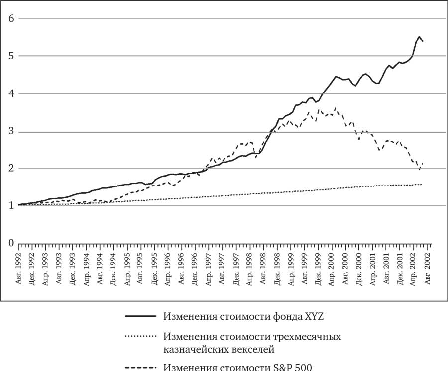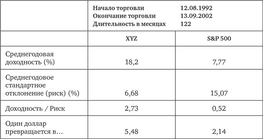 На графике сравнительных результатов XYZ показаны относительные значения совокупной стоимости XYZ, S&P 500 и казначейских векселей + 2 %. С конца 1994-го и приблизительно до 1 августа 2000 года продолжался один из крупнейших в истории периодов роста рынка. Индекс S&P 500 поднимался со средней скоростью 26 % в год, и его стоимость выросла за эти 5,6 года в 3,7 раза.