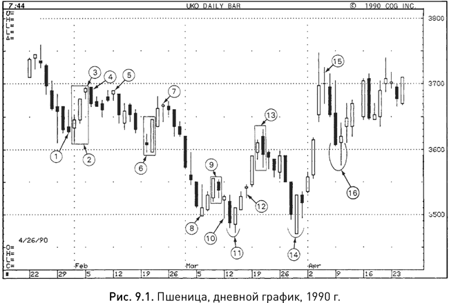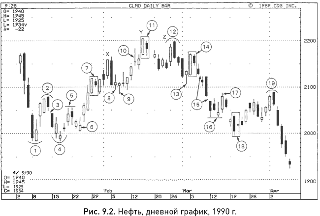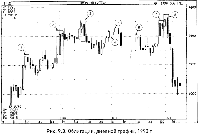 В первой части книги мы рассмотрели различные варианты японских свечей и свечных моделей, и настало время подвести некоторые итоги. На рисунках 9.1, 9.2 и 9.3 вы найдете графики, на которых отмечено множество уже знакомых вам свечных индикаторов. Предлагаю вам попробовать разобраться в них самостоятельно, заглядывая, если нужно, в глоссарий, помещенный в конце книги. Как именно следует воспринимать сигналы той или иной свечи или модели, решать только вам самим, хотя мое мнение будет изложено ниже.