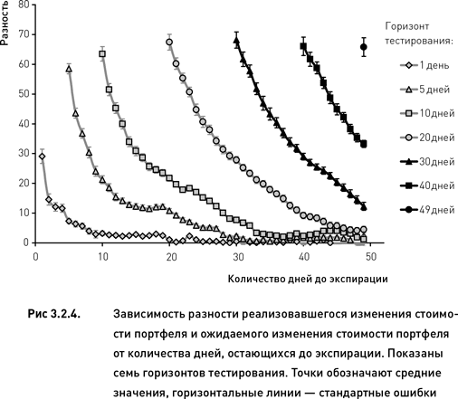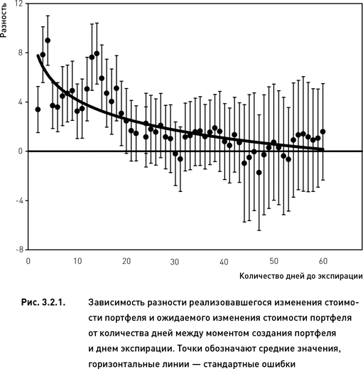 На рис. 3.2.1 показаны средние отклонения реально произошедших изменений стоимости портфеля от ожидаемых значений. Для портфелей, созданных в период от 30 до 60 дней до экспирации, средняя разность оказалась близка к нулю. Однако этим же портфелям свойственна и наибольшая изменчивость разности (представленная на рис. 3.2.1 в виде стандартных ошибок). Обратная картина наблюдается для портфелей, созданных незадолго до экспирации (от двух до 20 дней). В этих случаях разности реализовавшегося и ожидаемого изменений стоимости портфеля велики и положительны, хотя достаточно стабильны (стандартные ошибки невелики).