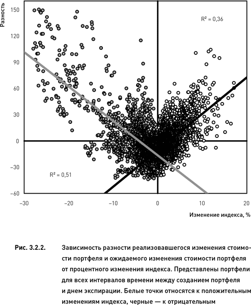 Из рис. 3.2.2 следует, что большие движения индекса действительно сопровождаются весьма серьезными отклонениями реальных изменений стоимости портфелей от прогнозных значений. Это наблюдение справедливо как для случаев роста индекса (белые точки на рис. 3.2.2), так и для случаев его падения (черные точки). Следует также отметить, что в тех случаях, когда индекс снижался, корреляция между разностью и изменением индекса была выше, чем когда индекс рос.