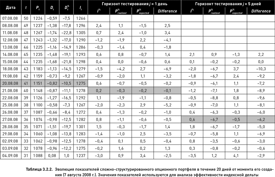 В таблице 3.2.2 представлен пример такого портфеля и показана эволюция его показателей. В момент создания портфеля (7 августа 2008 г., первая строка таблицы) оставалось 50 рабочих дней до даты экспирации опционов (17 октября 2008 г.). Во второй строке таблицы приведены характеристики этого же портфеля на следующий день после его создания, в третьей строке – на третий день и т. д. вплоть до экспирации (в целях экономии места в таблице 3.2.2 показаны только первые 20 дней существования портфеля).