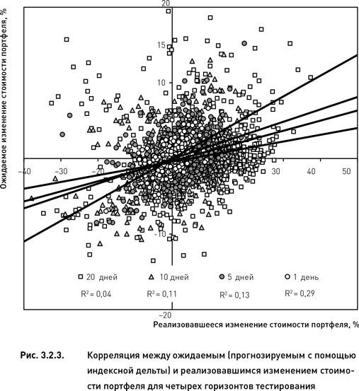 Регрессионный анализ, представленный на рис. 3.2.3, является наиболее простым и интуитивно понятным средством качественной оценки индексной дельты. Вместе с тем он не дает строгого количественного выражения эффективности этого индикатора риска. Для этих целей лучше подходит средняя разность реализовавшихся и ожидаемых изменений стоимости портфеля. Поскольку убыток коротких портфелей возникает в тех случаях, когда их стоимость возрастает P%realized > 0, положительные разности (P%realized > P%expected) свидетельствуют о том, что оценка риска с помощью индексной дельты занижена (то есть риск недооценен). Соответственно, отрицательные разности означают, что реальные изменения стоимости портфеля меньше ожидавшихся (то есть риск переоценен).