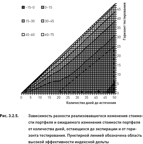 Полную информацию об эффективности индексной дельты и характере ее зависимости от двух исследуемых параметров (момента оценки и горизонта тестирования) дает представление данных в виде топографической карты. В двумерной системе координат будем откладывать по горизонтальной оси количество дней, остающихся до экспирации, а по вертикальной – горизонт тестирования. С помощью разных оттенков изобразим изолинии, отражающие средние разности реализовавшихся и ожидаемых изменений стоимости портфелей. Топография такой поверхности показана на рис. 3.2.5. Легко заметить, что область высокой эффективности индексной дельты располагается в правом нижнем углу диаграммы (показана на рисунке пунктирной линией). В целом можно заключить, что (1) индексная дельта позволяет довольно точно оценивать риск в первые 25–30 дней с момента создания портфеля; (2) эффективность этих оценок сохраняется в течение 20–25 дней с момента оценки. Треугольная форма зоны высокой эффективности указывает на то, что, с одной стороны, по мере приближения экспирации необходимо снижать горизонт прогнозирования. С другой стороны, использование больших горизонтов прогнозирования возможно лишь на начальном этапе существования портфеля.