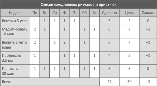 Тем не менее, поскольку это мощный и эффективный метод, его стоит добавить в ваш арсенал. Назовем его «Ежедневные ритуалы и привычки». Простая таблица будет каждый день напоминать вам о ключевых привычках, связанных с вашими главными целями.