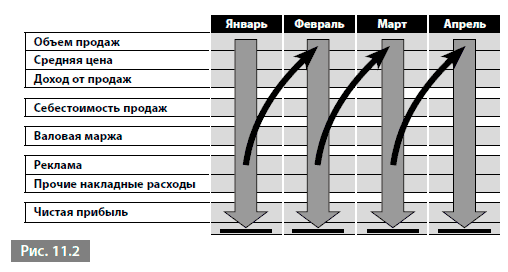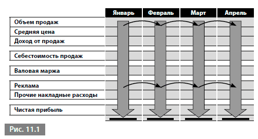 В моделях системной динамики тоже используется имитация по временным интервалам, но по-другому. Вместо того чтобы рассчитывать, скажем, объем продаж за март, применяя процент его роста за февраль, типичная модель системной динамики рассчитает его, исходя из, например, затрат на рекламу в феврале (или раньше), применив нечеткую переменную, такую как влияние рекламы на привлечение клиентов. Таким образом, модели системной динамики отражают петли обратной связи, которые действительно движут бизнесом (рис. 11.2).