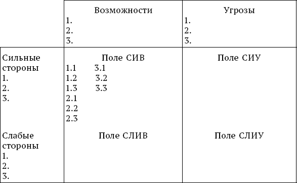 В каждом из полей, заполняемых аналогично полю СИВ, формируются конкретные меры, учитывающие комбинацию попарно отобранных факторов. Они должны быть направлены в поле СИВ на получение максимального выигрыша от сочетания сильных сторон и возможностей, в поле СЛИВ – на использование возможностей для преодоления слабостей, на поле СИУ – на изыскание мер по преодолению угроз за счет сильных сторон, на поле СЛИУ – на определение возможных потерь и поиск стратегии их минимизации. Практический пример матрицы SWOT представлен на рис. 22.