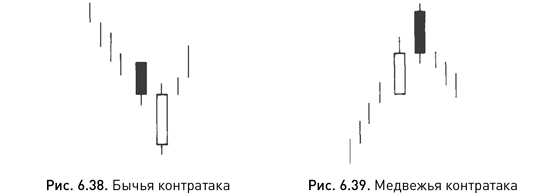 Важное требование к модели «контратака» заключается в том, что цена открытия второй свечи должна быть либо значительно выше цены закрытия предыдущего дня (при медвежьей контратаке), либо значительно ниже нее (при бычьей контратаке). Таким образом, во второй день рынок сначала энергично движется в направлении тренда, но к завершению торгов – сюрприз! – выясняется, что цена в конце концов осталась неизменной.