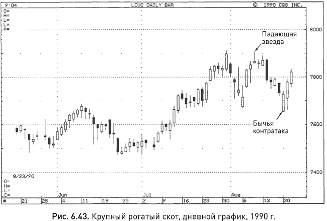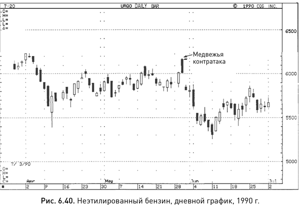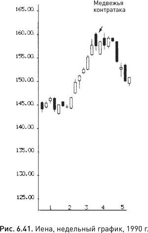 На рисунке 6.41 можно увидеть, как с появлением медвежьей контратаки завершилось продолжительное ралли. В свою очередь, рисунок 6.42 знакомит нас с примером модели «бычья контратака» – она прервала падение цен, стартовавшее в марте 1989 г. с медвежьей модели поглощения. Запомните: как и другие индикаторы разворота, контратака необязательно сигнализирует о смене тенденции на противоположную, она лишь говорит о вероятном завершении предыдущего тренда. Так, в данном случае после бычьего сигнала разворота рынок перешел от снижения к боковому движению. Кроме того, этот пример наглядно иллюстрирует, что модель «контратака» может работать даже тогда, когда цены закрытия двух составляющих ее свечей бывают очень близки, но не совпадают в точности.