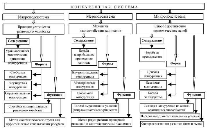 На макроуровне конкуренция проявляется как отношение, отражающее противоборство обезличенных частных интересов. Это ещё не борьба, а только база для её ведения. Борьба разворачивается на микроуровне конкуренции, принимая форму действий, автоматически вызывающих противодействие. Борьба становится моделью поведения, предписывающей конкурентам строго определенный тип действий: ограничить возможности соперников в достижении поставленных целей. На мезоуровне конкуренция проявляется как механизм соперничества анонимных капиталов. Но оно может быть реализовано только посредством борьбы между продуктами, произведёнными капиталами. Это превращение и придаёт экономический смысл их борьбе, состоящей в перераспределении воплощённой в продукте прибыли. На микроуровне соперничают не анонимные силы, а борются конкретные субъекты за осязаемые цели. Конкуренция из абстрактного соперничества превращается в реальную борьбу предпринимателей за отчуждение прибыли друг у друга. Это борьба за конкретные цели против осязаемых соперников, где конкуренты ощущают себя как соперники, борющиеся за превосходства друг над другом. Поэтому для конкурентов конкуренция всегда представляется условием, которое препятствует достижению поставленных целей.