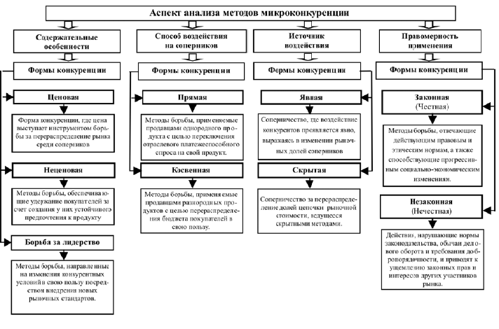 Особенность микроконкуренции – множество приёмов, применяемых соперниками для достижения своих целей. Эти приёмы суть формы, посредством которых ведётся борьба на микроуровне конкуренции. Их многообразие может быть подвергнуто группировке (типологии) на основе общности, присущей отдельным приёмам. Каждый приём борьбы можно определить как метод конкуренции, а совокупность методов, объединенную одним типологическим признаком, – как форму конкуренции. Типология оправдана, так как позволяет 1) упростить анализ, 2) выделить качественные различия среди методов, 3) вскрыть специфику влияния каждой формы на подсистему.