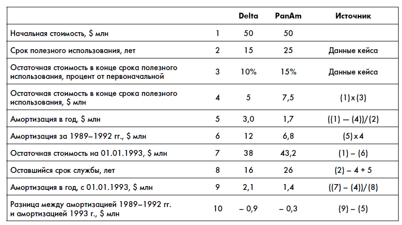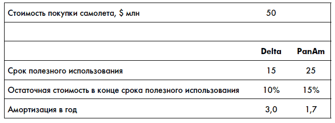 Мы видим, что амортизация PanAm значительно больше, чем у Delta. Значит, и прибыль в финансовой отчетности PanAm при прочих равных условиях будет выше. Чем могут быть объяснены такие различия? Есть два варианта.